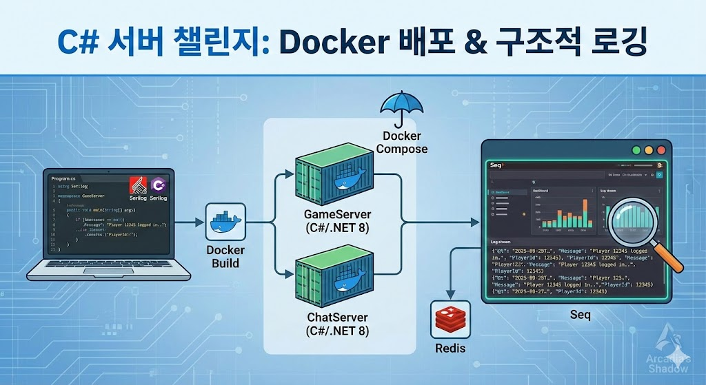 당신의 임무는 GameServer와 ChatServer를 Docker 이미지로 만들어 어디서든 동일하게 실행되도록 하고, Serilog를 도입하여 로그를 JSON 형식으로 남겨 기계가 분석할 수 있도록(Machine-readable) 만드는 것입니다.