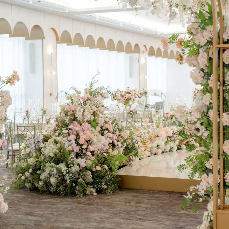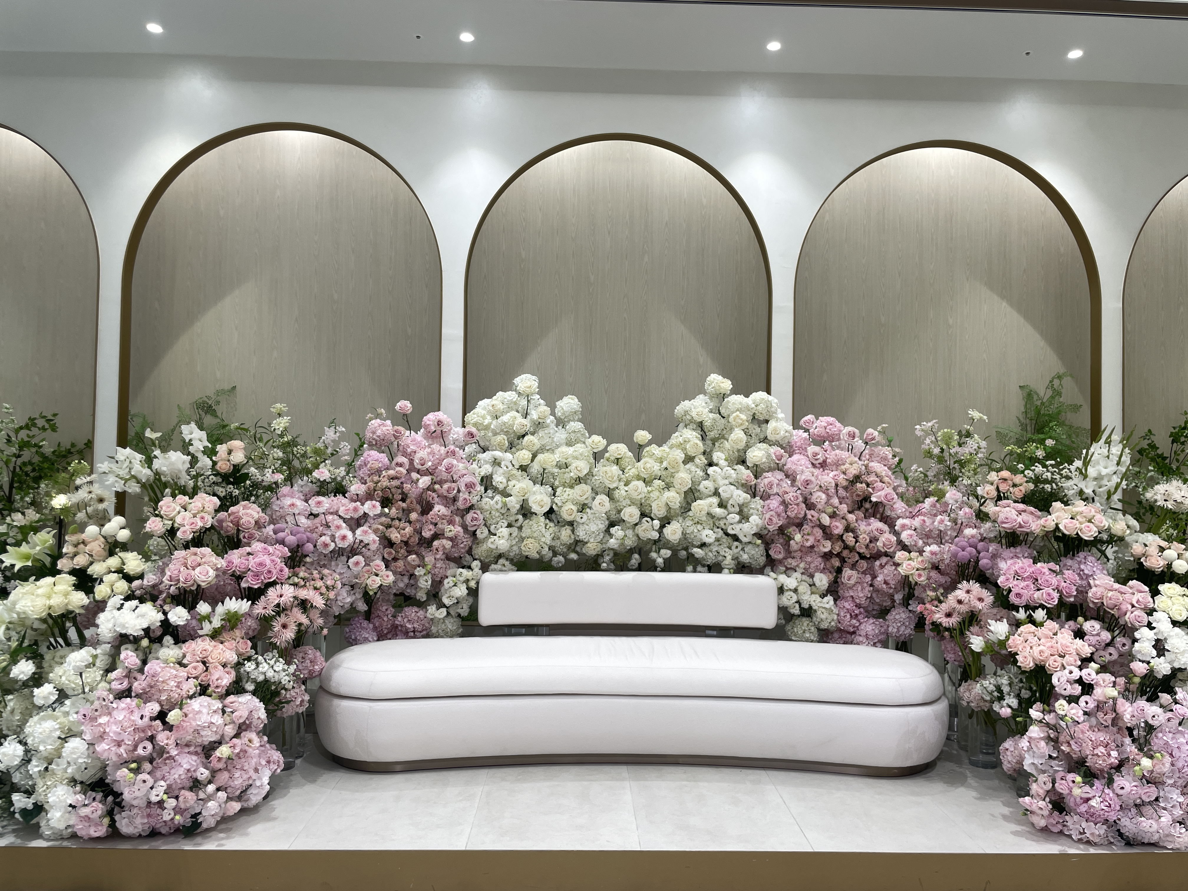 플라워 데코 (화이트+핑크+그린): 제가 딱 원하던 조합! 화이트 핑크 그린 톤의 꽃 장식이 과하지 않으면서도 풍성하게 어우러져, 마치 싱그러운 야외 정원에서 결혼하는 듯한 느낌을 줍니다.