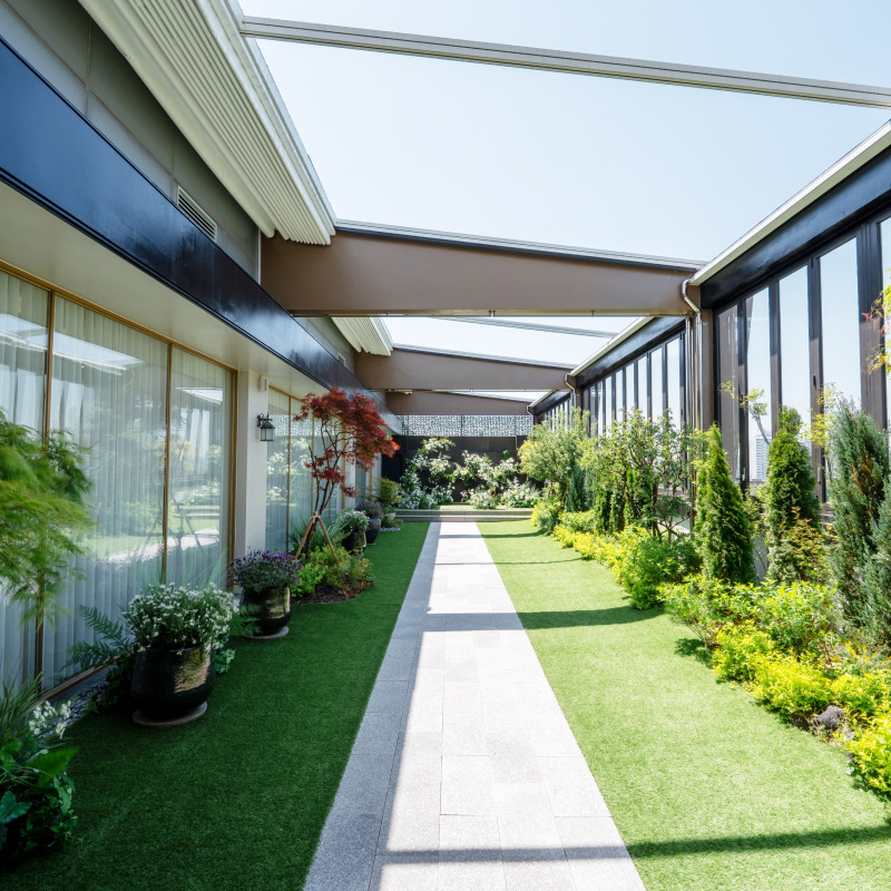 홀 옆 포토존 (테라스): 홀 바로 옆에 정말 예쁜, 야외처럼 꾸며놓은 테라스 공간이 있어요! (완전한 야외는 아니에요.) 하객들이 이용하는 공간은 아니고, 신랑 신부가 미리 와서 본식 스냅을 찍는 공간이라고 해요. 여기서도 야외 결혼식 감성의 사진을 잔뜩 남길 수 있을 것 같아 너무 기대됩니다!