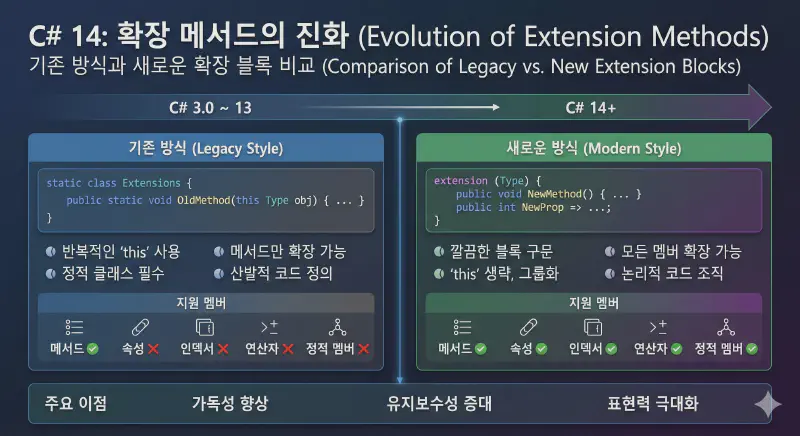 C# 14의 확장 블록은 이 모든 고민을 해결해 줘요. 이제 메서드뿐만 아니라 프로퍼티, 연산자, 정적 멤버까지 한 번에 정의할 수 있답니다.