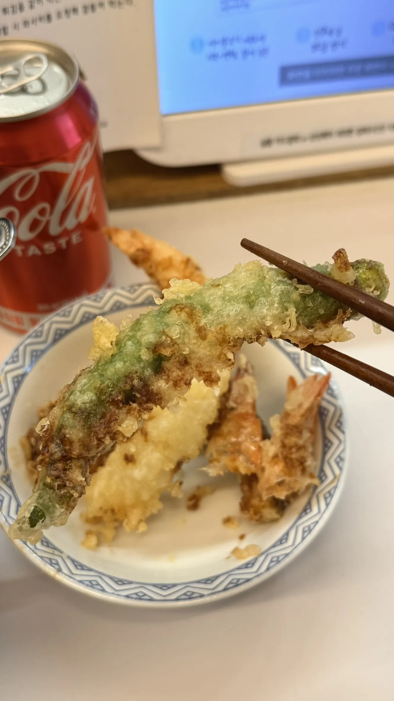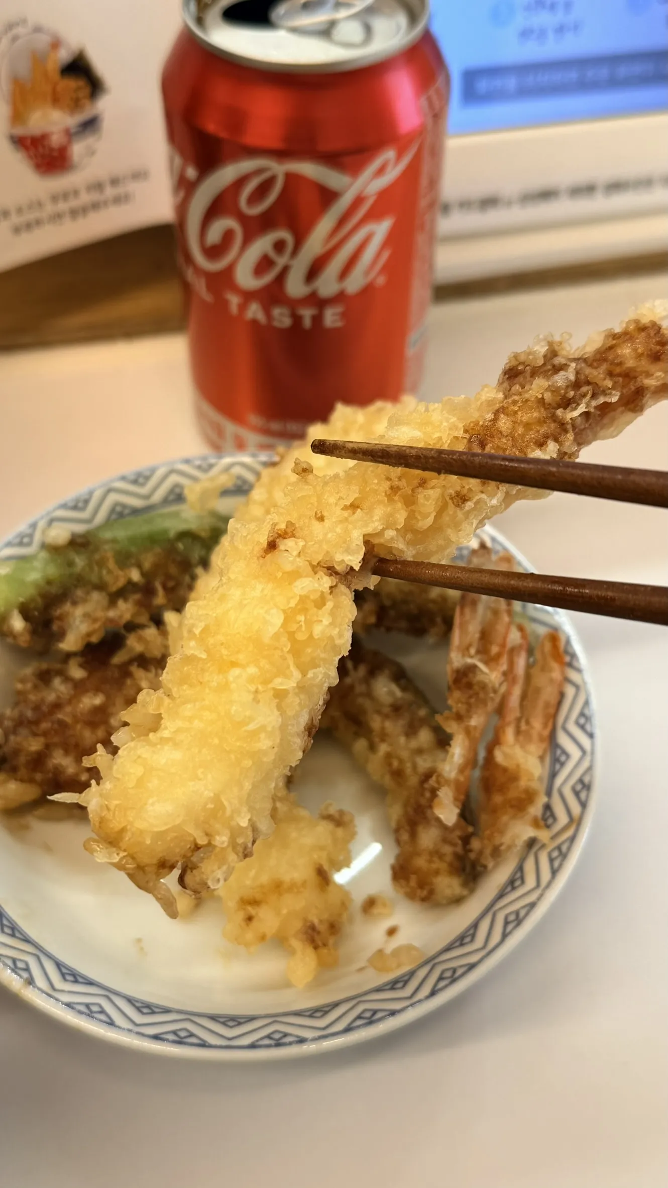 바삭한 튀김 옷 안에서 단호박의 채즙이 쏟아지는 느낌이라기보다는, 살짝 불쾌할 정도로 수분감이 많아서 튀김보다는 그냥 익힌 채소를 먹는 듯한 느낌이 강했습니다. 텐동은 각 재료가 가진 수분을 적절히 날려 풍미를 살리는 게 중요한데, 단호박에서는 그런 디테일이 부족해 보였습니다.